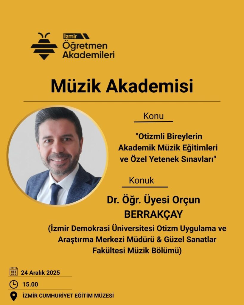 24 Aralık 2025 tarihinde Milli Eğitim Bakanlığı Öğretmen Akademileri Müzik Akademisi kapsamında İzmir Demokrasi Üniversitesi Otizm Uygulama ve Araştırma Merkezi Müdürü Dr. Öğr. Üyesi Orçun Berrakçay tarafından “Otizmli Bireylerin Akademik Müzik Eğitimleri ve Özel Yetenek Sınavları” başlıklı sunum yapıldı. Moderatörlüğünü İzmir İl Milli Eğitim Müdürlüğü Arge biriminden Özlem Kaya’nın yaptığı Müzik Akademisi, İzmir Cumhuriyet Eğitim Müzesi’nde gerçekleştirildi. Berrakçay tarafından yapılan sunumda; otizm ve müzik ilişkisi kapsamında ilkokuldan doktora seviyesine kadar otizmli bireylerin akademik müzik eğitim süreçlerinin nasıl sürdürüldüğü, öğrencilerin ve ailelerinin nasıl yönlendirilmesi gerektiği, eğitimci eğitimlerinin önemi, makul uyarlamalar ve özel yetenek sınavlarındaki yasal düzenleme önerileri anlatıldı. Sunuma İzmir Demokrasi Üniversitesi Sosyal Bilimler Enstitüsü Müzik Bölümü Yüksek Lisans Öğrencisi Erdoğan Erdemirdöven de katıldı. Kendi başarı hikayesi ve müzik performansıyla öğretmenlerden büyük beğeni topladı.