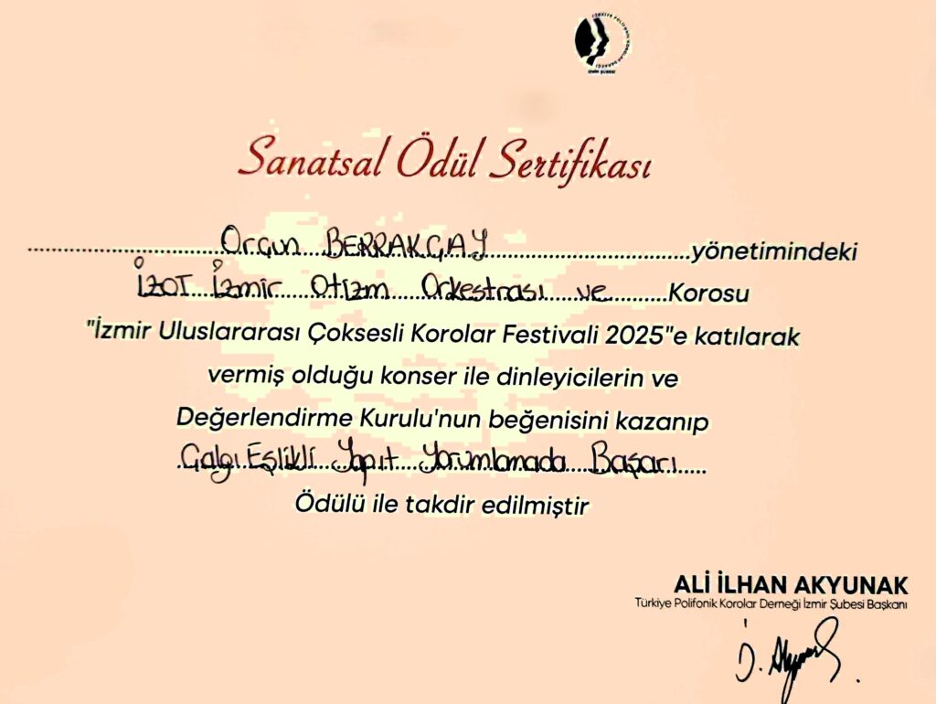 25 Mayıs 2025 tarihinde İzmir’de Ahmed Adnan Saygun Sanat Merkezi’nde düzenlenen İzmir Uluslararası Çoksesli Korolar Festivali’nde İzmir Demokrasi Üniversitesi Otizm Uygulama ve Araştırma Merkezi Müdürü Dr. Öğr. Üyesi Orçun Berrakçay şefliğinde İZOT İzmir Otizm Orkestrası ve Korosu olarak sahne aldık. İzmir Demokrasi Üniversitesi Güzel Sanatlar Fakültesi Müzik Bölümü Lisans Mezunu Beril Zorlu (piyano), lisans öğrencileri Erdoğan Erdemirdöven (keman) ve Deniz Can Ertan (korist) da İZOT üyesi olarak sahnede yer aldılar. Jüri değerlendirmesi sonucunda İZOT’a “Çalgı Eşlikli Yapıt Yorumlamada Başarı” ödülü verildi.
