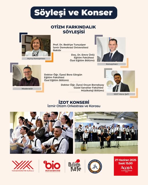 27 Haziran 2025 tarihinde Yükseköğretim Kurulu (YÖK) tarafından üniversitelerde kurulması teşvik edilen Bilim İletişimi Ofisleri’nin tanıtımı kapsamında Türkiye genelinde eş zamanlı olarak düzenlenen Bilim Kafe etkinliklerinin İzmir Demokrasi Üniversitesi ayağı, Bilim İletişimi Ofisi koordinasyonunda, otizm temasıyla gerçekleştirildi. İzmir Balçova Agora Alışveriş Merkezi’nde moderatörlüğünü Özel Eğitim Bölümü Dr. Öğr. Üyesi Bora Görgün’ün yaptığı, İzmir Demokrasi Üniversitesi Otizm Uygulama ve Araştırma Merkezi Müdürü Dr. Öğr. Üyesi Orçun Berrakçay ile Özel Eğitim Uygulama ve Araştırma Merkezi Müdürü Doç. Dr. Emre Ünlü’nün konuşmacı olarak katıldığı söyleşiden sonra İZOT İzmir Otizm Orkestrası ve Korosu olarak bir farkındalık konseri verdik. Konseri Rektör Prof. Dr. Bedriye Tunçsiper, Rektör Yardımcısı Prof. Dr. Berna Dirim Mete, Güzel Sanatlar Fakültesi Dekanı Prof. Dr. Nuray Gümüştekin, öğretim üyeleri, aileler ve alışveriş merkezi misafirleri izlediler.